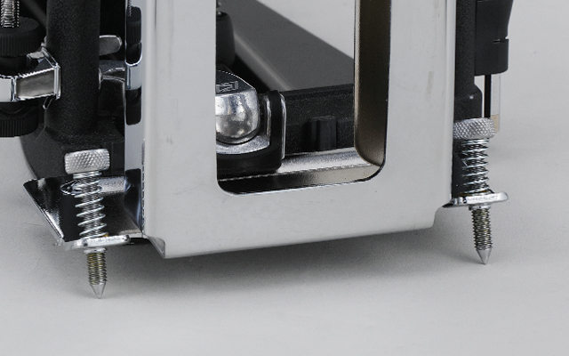 Utilizando uma base larga e ampla, com duas pernas e âncoras ajustáveis que eliminam o "deslizamento" do bumbo em superfícies acarpetadas, o pad de bumbo se mantém ancorado e sólido.